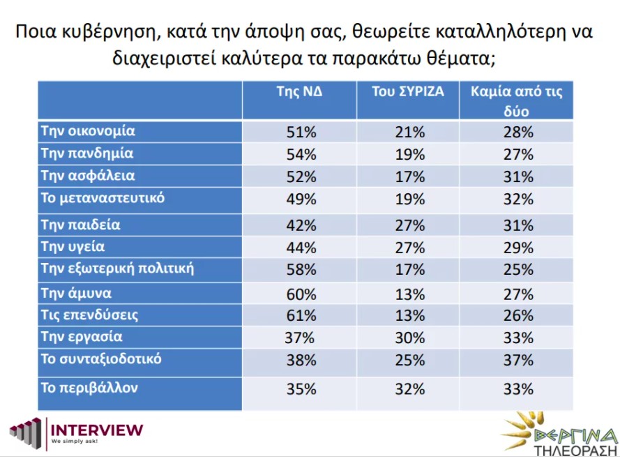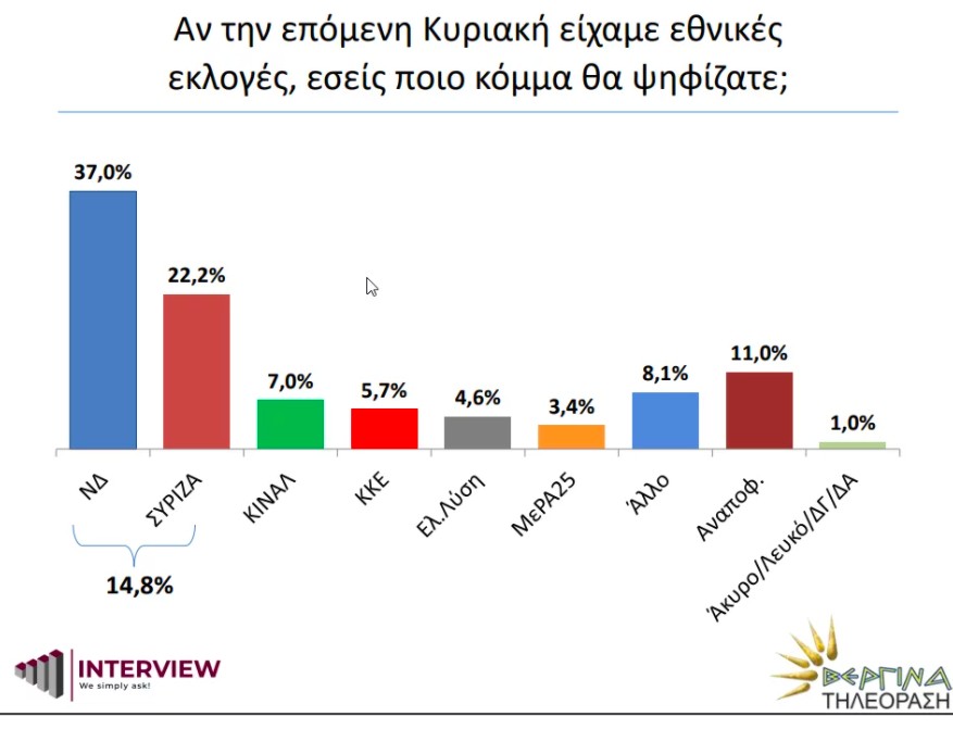Σύμφωνα με τη νέα πανελλαδική δημοσκόπηση που διενήργησε η INTERVIEW (17 έως 23 Ιουνίου 2021) για τη Βεργίνα Τηλεόραση το 37% θα ψήφιζε ΝΔ εάν την ερχόμενη Κυριακή είχαμε εκλογές.
