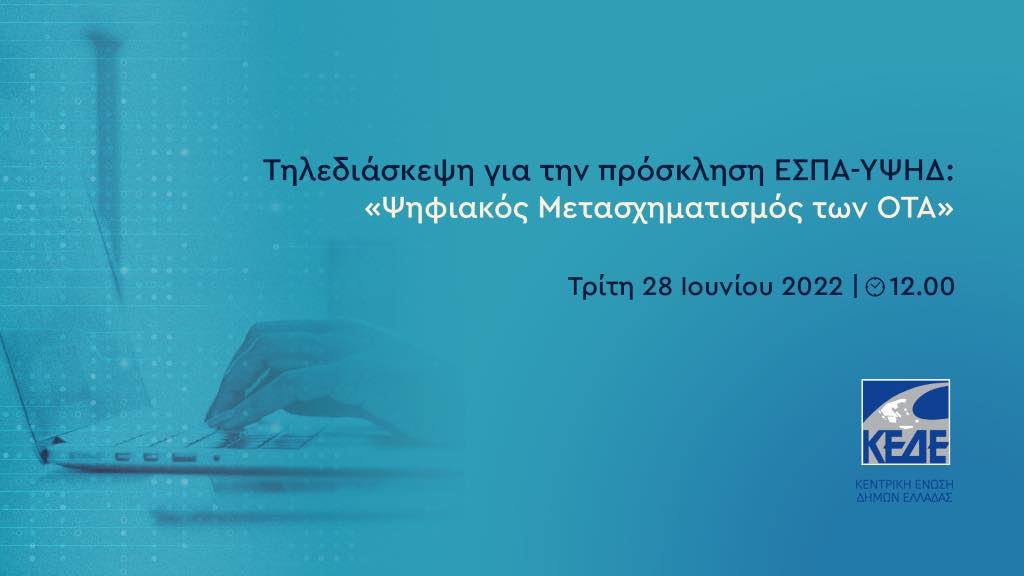 Η Κεντρική Ένωση Δήμων Ελλάδας, συνεχίζοντας να παρέχει τεχνογνωσία και στήριξη στους Δήμους όλης της χώρας, προκειμένου ο βαθμός ετοιμότητας των Οργανισμών Τοπικής Αυτοδιοίκησης να είναι υψηλός ώστε να αξιοποιούν συνεχώς ευκαιρίες χρηματοδότησης, διοργανώνει τηλεδιάσκεψη με αφορμή την πρόσκληση ΕΣΠΑ-ΥΨΗΔ «Ψηφιακός Μετασχηματισμός των Δήμων».