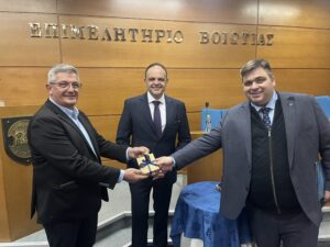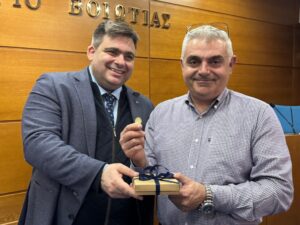 Τα αναμνηστικά τους παρέδωσαν ο Πρόεδρος της Κεντρικής Ένωσης Επιμελητηρίων, κ. Γιάννης Βουτσινάς, και ο Πρόεδρος του Επιμελητηρίου Βοιωτίας, κ. Κωνσταντίνος Στάικος.